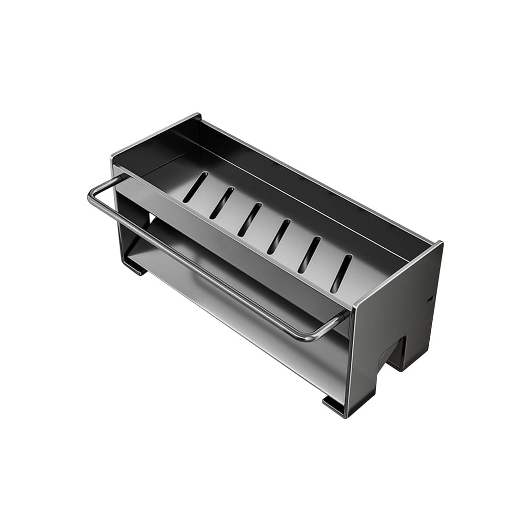 Rak ini khusus digunakan di area wastafel untuk menyimpan perlengkapan mencuci piring agar tetap terorganisir dan kering. Desain drainase pada bagian bawah memastikan air tidak menggenang, sehingga spons dan sikat tetap bersih dan bebas jamur. Selain itu, pegangan samping dapat dimanfaatkan untuk menggantung lap atau handuk kecil agar cepat kering dan selalu siap digunakan.